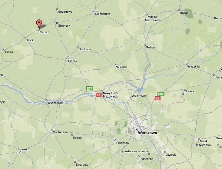 (Warszawa). Raciaz is Northwest of Warsaw and Northeast of Plock